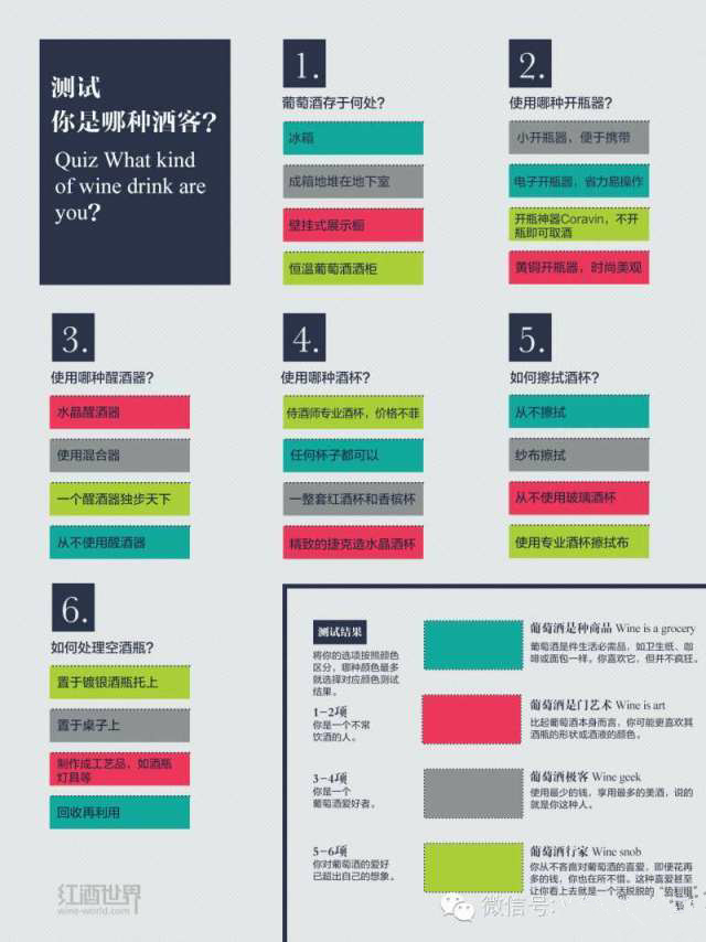 想知道你在別的酒客眼中是什么樣子的嗎?是能從琳瑯滿目的貨架上選擇最具性價(jià)比的葡萄酒極客,還是獨(dú)具慧眼辨識(shí)那些適合陳年美酒的葡萄酒行家?不管你是屬于哪一種,在博大精深的葡萄酒文化面前,要想真正成為多面手多少都有些難度。因此,關(guān)注一些自己的特殊愛好,成為當(dāng)下很多人的不二之選。本文通過6道簡(jiǎn)單的問題幫您正確定位自己在葡萄酒世界的立場(chǎng)或地位,“知己知彼”就從這里開始!