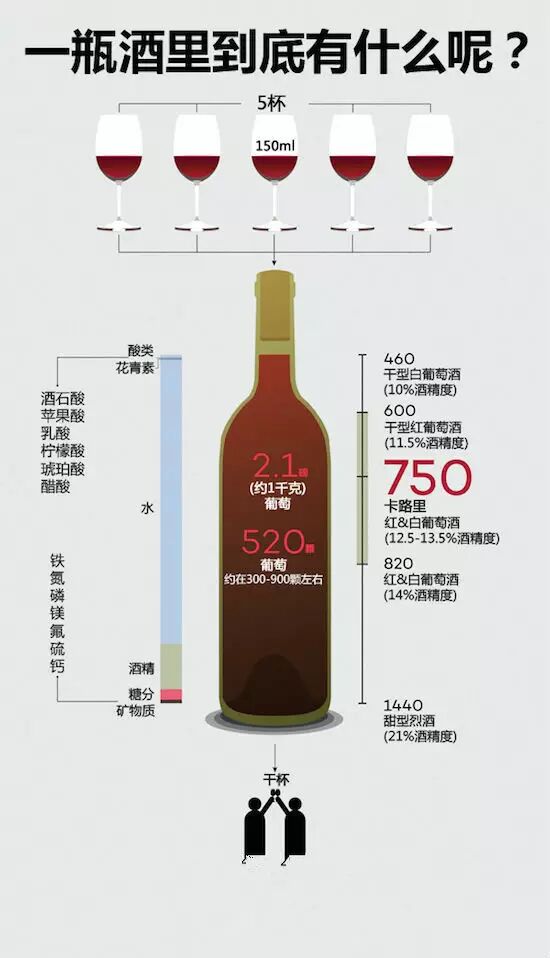 一瓶葡萄酒750ml,一個酒杯可以倒150ml,必須是5杯葡萄酒啊!這么一個簡單的算術(shù)題小編會讓你算嗎?那么一瓶酒里到底有什么呢?葡萄酒里可豐富了,一起來看下這張圖吧!